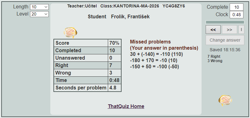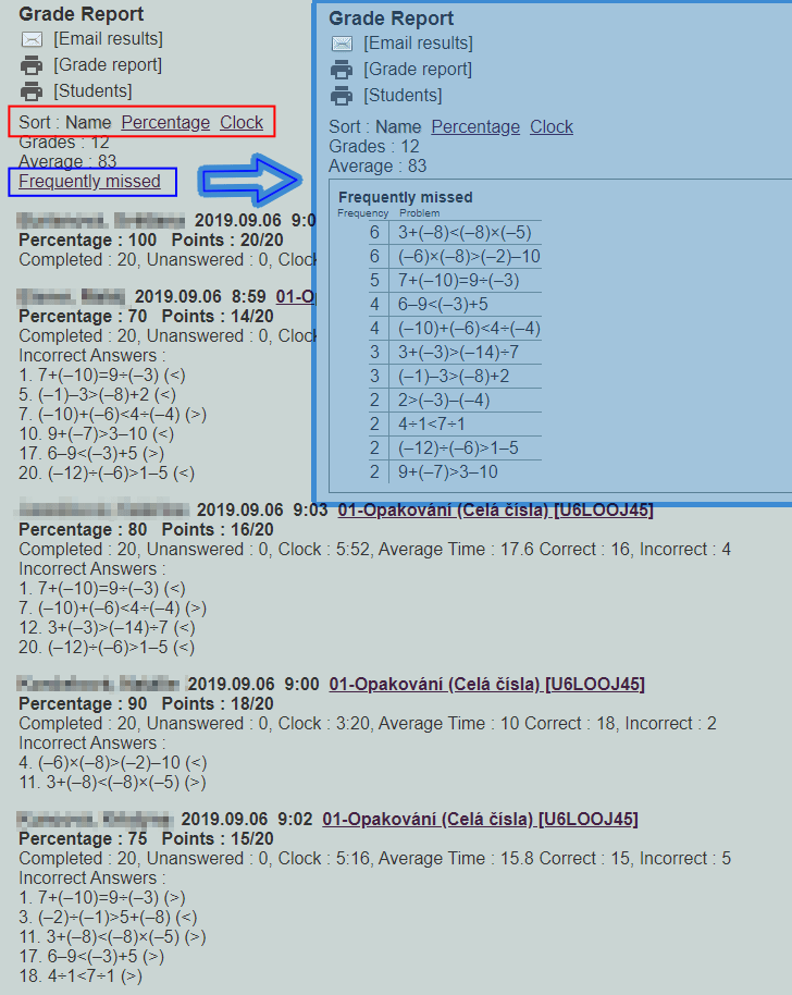 A Detailní pohled na jednotlivé testy (kliknutím na název testu nahoře v záhlaví tabulky) s možností seřadit si studenty nejen podle jména, ale hlavně podle úspěšnosti nebo podle času, který potřebovali k vyplnění testu. Velkým bonusem je potom zobrazení tabulky s příklady, kde žáci dělali nejčastěji chyby. Samozřejmostí jsou potom podrobné informace o každém žákovi (počet nezodpovězených otázek, počet chyb a konkrétní příklady, kde a jaká chyba se objevila, čas potřebný k vyřešení celého testu i přepočítaná průměrná hodnota na jeden příklad). Všechny informace můžete tisknout, případně poslat studentům na e-mail.