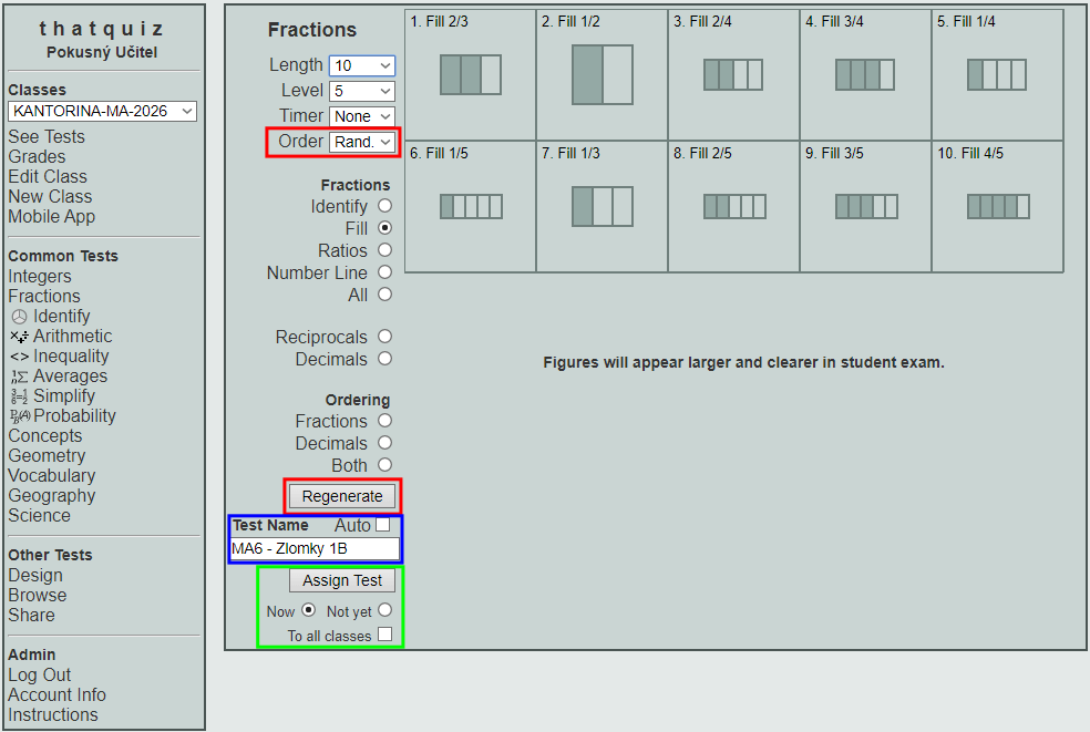 Dalším novinkou je oblast TEST NAME. Volba AUTO bude po každém generování nabízet nové jméno testu, což není moc pohodlné. Doporučuji ji VYPNOUT. Druhé políčko pak následně slouží pro vaše označení testu. Něco jako třeba v tomto případě MA6 – Zlomky 1B… 😉