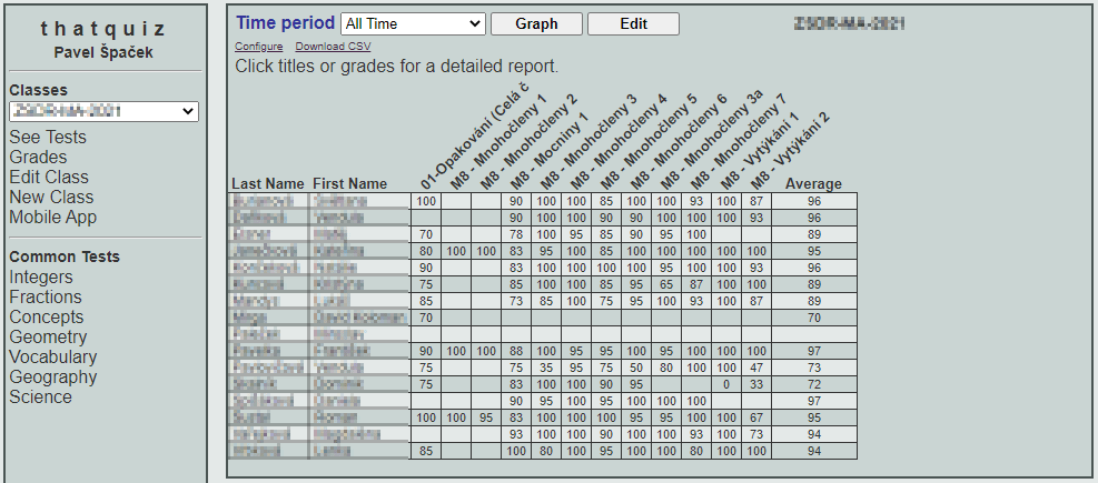 Je to jednoduché. ThatQuiz naštěstí o všech testech v dané třídě ukládá podrobnosti a vytváří z nich relativně přehlednou a interaktivní tabulku. Stačí kliknout v levém sloupečku na GRADES.