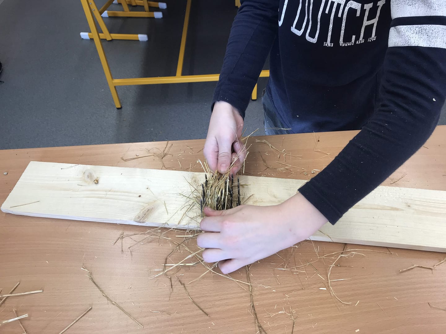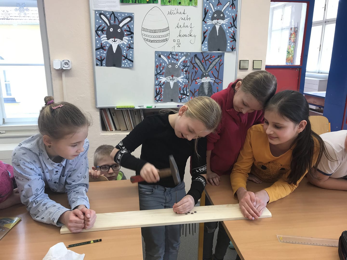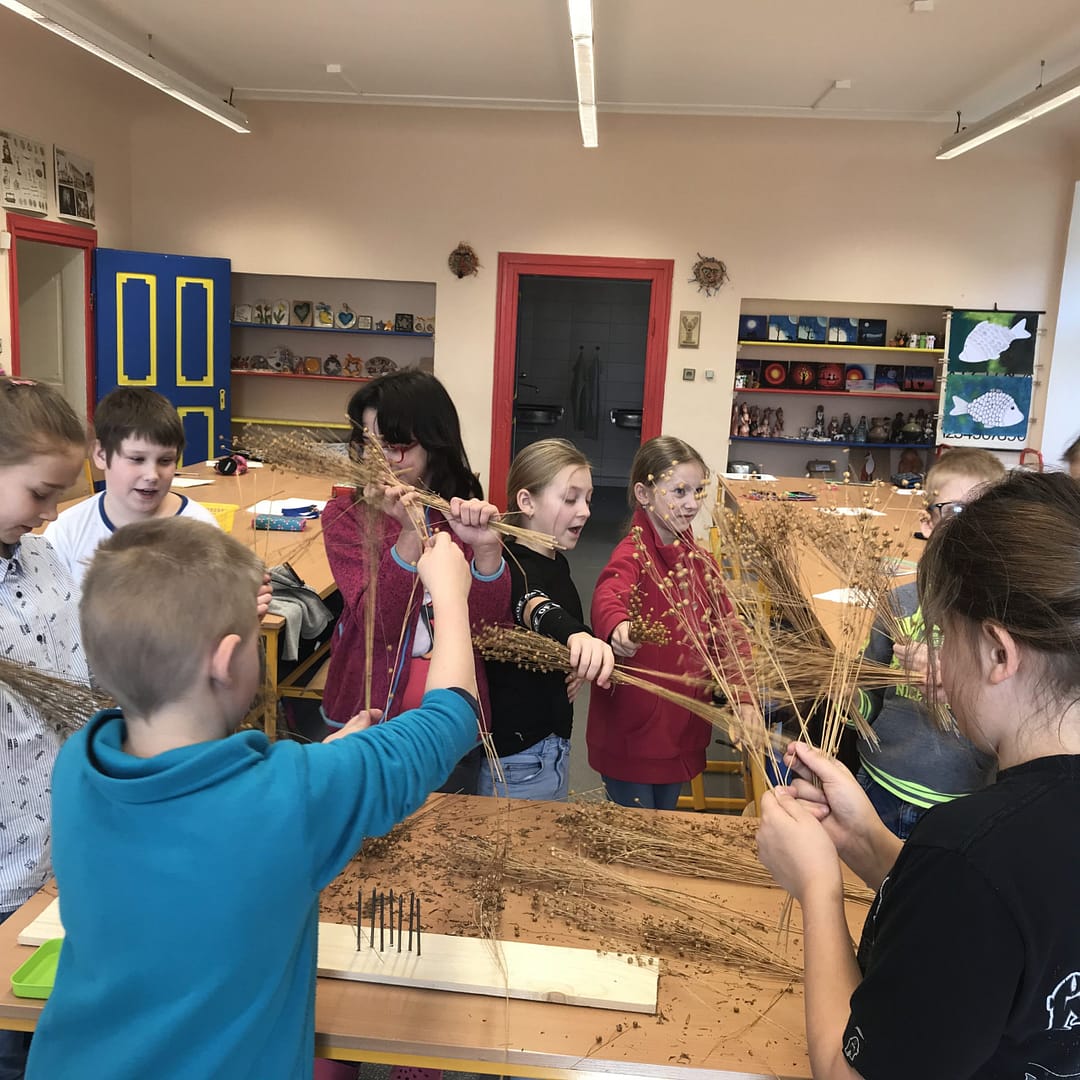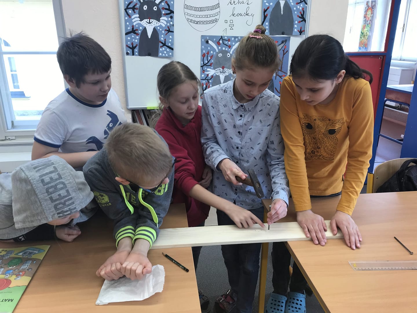 Na co se všichni těšili byla práce – skutečná ruční výroba nářadí a trochu zjednodušený postup zpracování lnu. I já se těšila, protože jsem věděla, že budou muset přemýšlet a také měřit (zrovna jsme v matematice procvičovali jednotky délky, tak jsem jim zadala úkol inspirovaný lnem – vyrobte pomocí prkýnka a 20 krátkých hřebíků vochlici, prkýnka a dlouhých hřebíků drhlen; dlouhé hřebíky si vzali podle počtu lidí ve skupině). Zároveň to pro mě byla zpětná vazba, protože o tom, jak musí vypadat vochlice a drhlen, k čemu slouží, jsme se bavili v prvních hodinách.