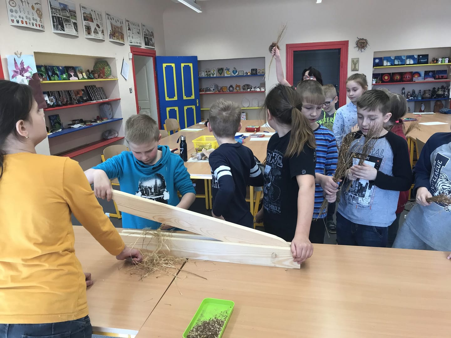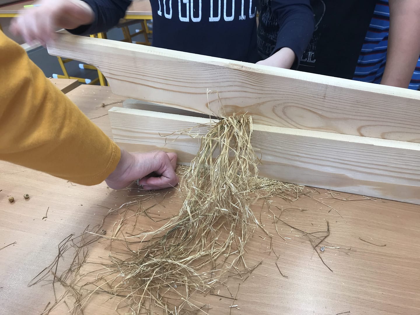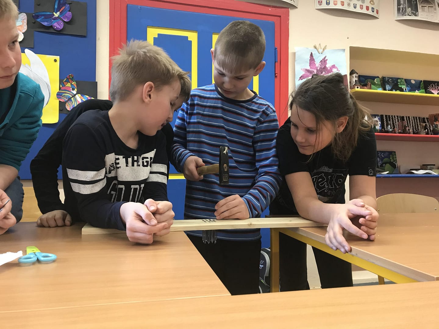 Na co se všichni těšili byla práce – skutečná ruční výroba nářadí a trochu zjednodušený postup zpracování lnu. I já se těšila, protože jsem věděla, že budou muset přemýšlet a také měřit (zrovna jsme v matematice procvičovali jednotky délky, tak jsem jim zadala úkol inspirovaný lnem – vyrobte pomocí prkýnka a 20 krátkých hřebíků vochlici, prkýnka a dlouhých hřebíků drhlen; dlouhé hřebíky si vzali podle počtu lidí ve skupině). Zároveň to pro mě byla zpětná vazba, protože o tom, jak musí vypadat vochlice a drhlen, k čemu slouží, jsme se bavili v prvních hodinách.