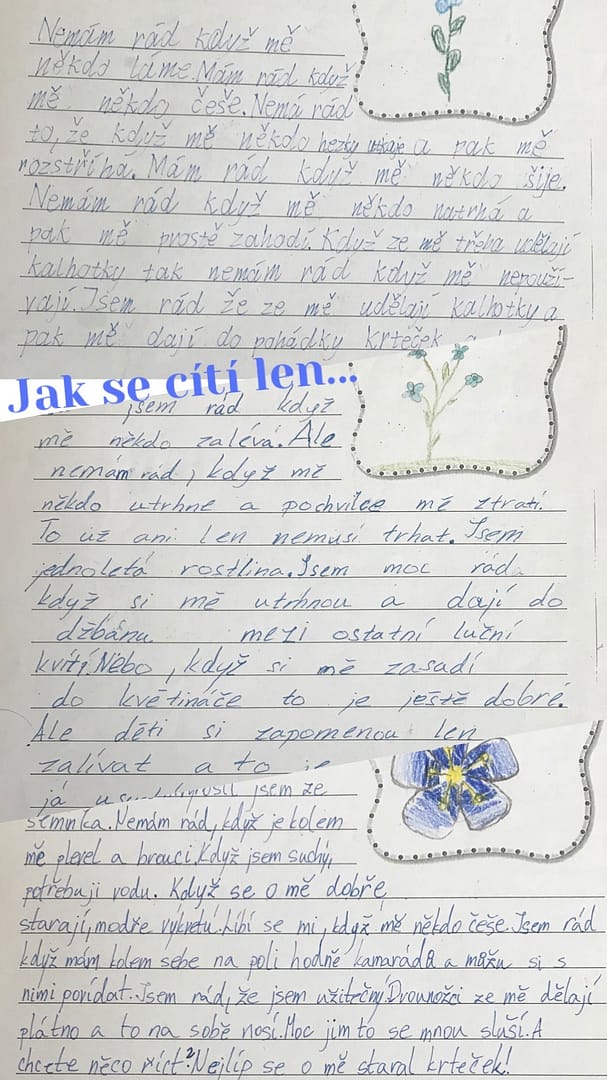 Následující den jsme ve slohu využili zážitky z předešlého dne a „tvořivě psali“ na téma: Jak se len cítí?