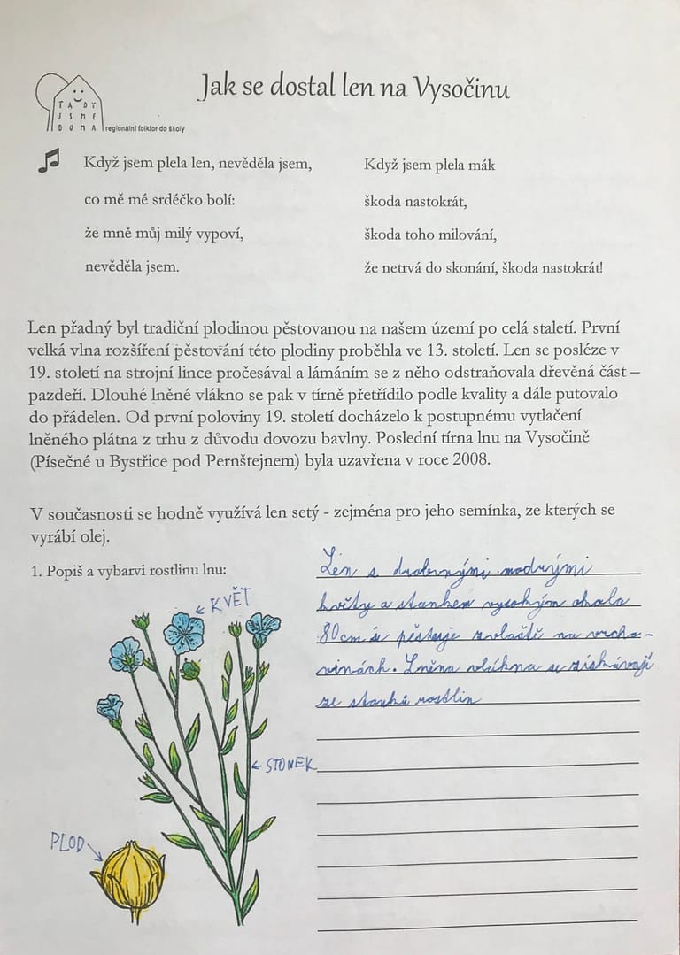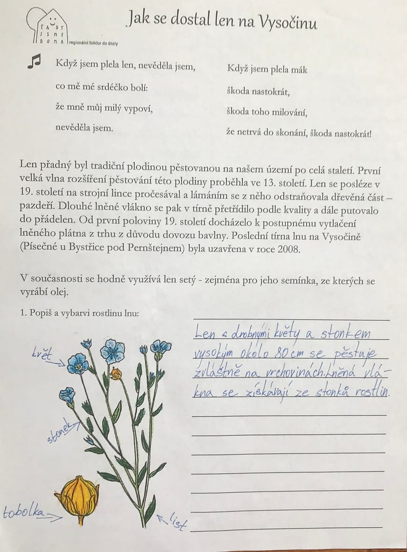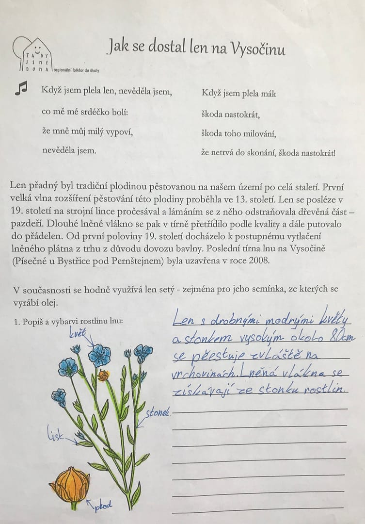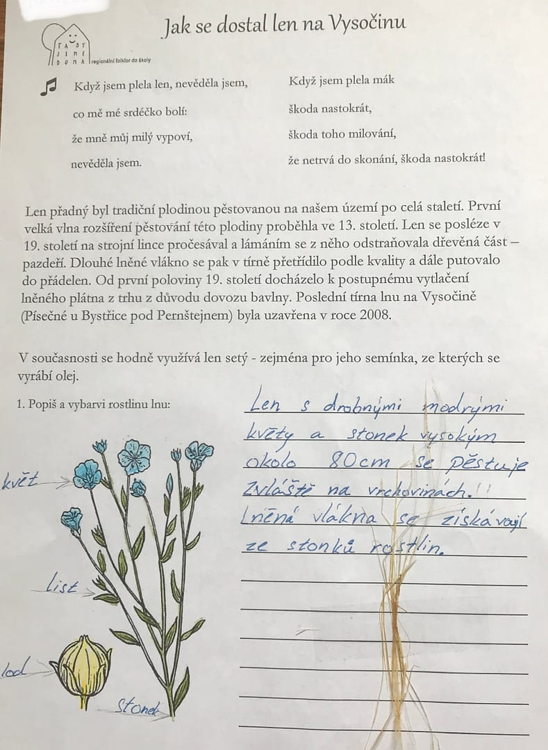 U nás na Bystřicku bývala lnářská oblast. Ze svých dětských let si pamatuji, jak naší vesnicí jezdívala naložená auta s velkými stočenými balíky lnu, které se zpracovávaly v nedalekém Čemolenu. Snad proto ve mně dřímá touha stále dětem připomínat, že len jako rostlina byla pro náš kraj velmi důležitým zdrojem obživy.